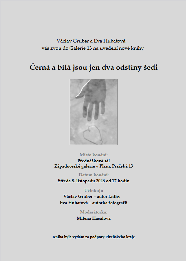 Srdečně vás zveme na uvedení knihy spisovatele Václava Grubera s názvem Černá a bílá jsou jen dva odstíny šedi. Jde o sbírku povídek, které doprovází fotografie Evy Hubatové. Křest proběhne ve středu 8. listopadu od 17 hodin v plzeňské Galerii 13.